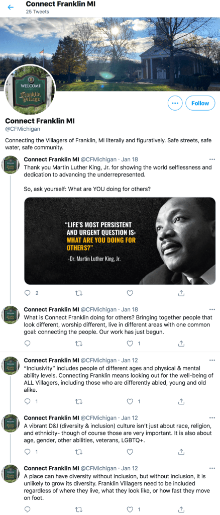 Connect Franklin markets diversity and inclusion as a way to garner support, which is not surprising given many of the leaders are on or are connected to Franklin Village’s DE&I committee.