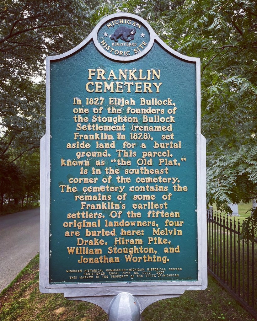 The historic Franklin Cemetery is prominently situated in the center and at the highest point in the village. Established in 1830, three years after the village’s founding in 1827, it is the third-oldest active cemetery in Michigan. It is recognized as a historic country cemetery and is listed on the National Register of Historic Places.