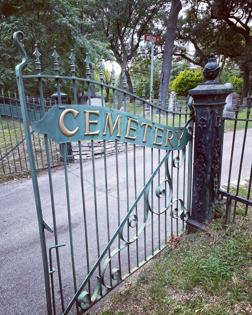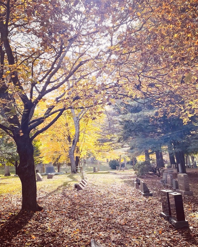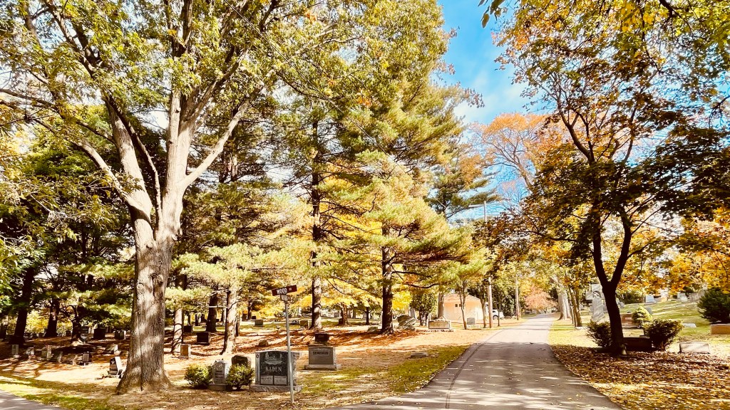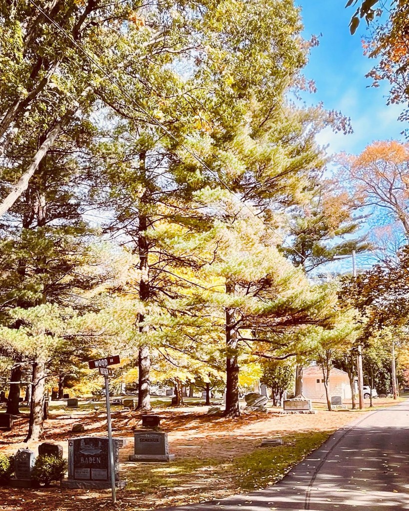 The cemetery features picturesque grounds, with gently rolling hills, towering mature trees, and a peaceful, meticulously maintained setting.